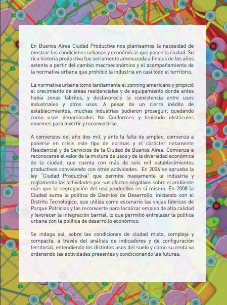 En Buenos Aires Ciudad Productiva nos planteamos la necesidad de mostrar las condiciones urbanas y económicas que posee la ciudad. Su rica historia productiva fue seriamente amenazada a finales de los años setenta a partir del cambio macroeconómico y el acompañamiento de la normativa urbana que prohibió la industria en casi todo el territorio. La normativa urbana tomó tardíamente el zonning americano y propició el crecimiento de áreas residenciales y de equipamiento donde antes había zonas fabriles, y desfavoreció la coexistencia entre usos industriales y otros usos. A pesar de un cierre inédito de establecimientos, muchas industrias pudieron proseguir, quedando como usos denominados No Conformes y teniendo obstáculos enormes para invertir y reconvertirse. A comienzos del año dos mil, y ante la falta de empleo, comienza a ponerse en crisis este tipo de normas y el carácter netamente Residencial y de Servicios de la Ciudad de Buenos Aires. Comienza a reconocerse el valor de la mixtura de usos y de la diversidad económica de la ciudad, que cuenta con más de seis mil establecimientos productivos conviviendo con otras actividades. En 2006 se aprueba la ley "Ciudad Productiva" que permite nuevamente la industria y reglamenta las actividades por sus efectos negativos sobre el ambiente más que la segregación del uso productivo en sí mismo. En 2008 la Ciudad suma la política de Distritos de Desarrollo, iniciando con el Distrito Tecnológico, que utiliza como escenario las viejas fábricas de Parque Patricios y las reconvierte para localizar empleo de alta calidad y favorecer la integración barrial, lo que permitió entrelazar la política urbana con la política de desarrollo económico. Se indaga así, sobre las condiciones de ciudad mixta, compleja y compacta, a través del análisis de indicadores y de configuración territorial, entendiendo los distintos usos del suelo y como su renta va ordenando las actividades presentes y condicionando las futuras